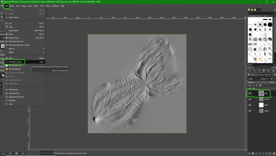 4. Swap back to your Layer tab, then in your menu bar go to "Edit -> Clear" to delete the selected areas. This basically copies the contents of the Red channel to the Alpha channel.