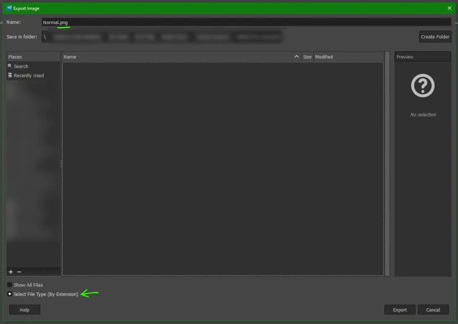16. Select a save location for your file, and name it to whatever you choose. Check the vanilla game textures to see what naming conventions are used for the files the textures are for. I personally also export a .png version to keep as a backup, but you will need a .dds file for the game. You can either rename your file with the .dds extension, or click "Select File Type (By Extension)" at the bottom to select the .dds file type. Once ready, just click "Export" to save your texture. A window will pop-up with export options. For .png, just leave everything at default.
