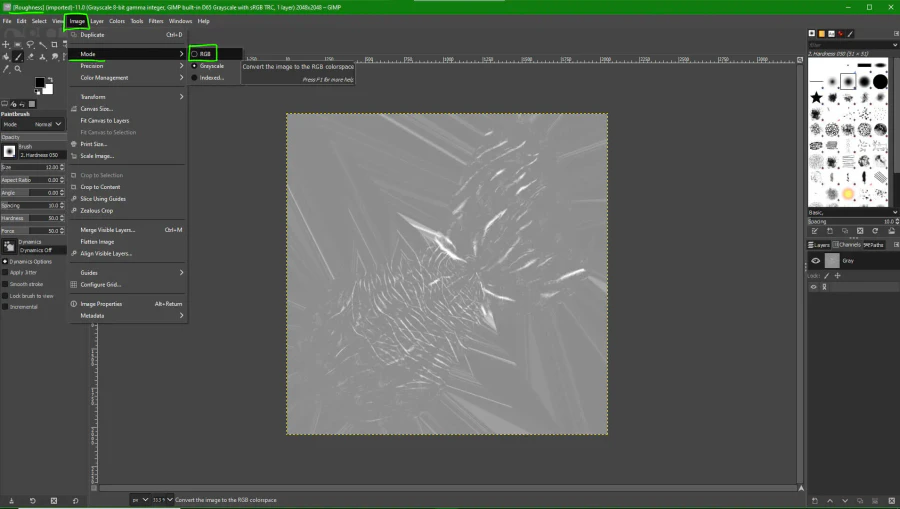 2. Go to your Roughness Map and in the menu bar, go to "Image -> Mode -> RGB" to convert your image from Grayscale mode to RGB mode. This creates the RGB channels needed.