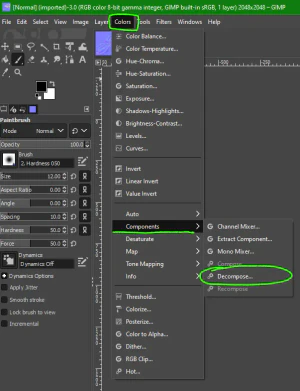 4. In the menu bar, go to "Colors -> Components -> Decompose". This is going to create and open a new version of your file, with all the channels separated into individual layers.