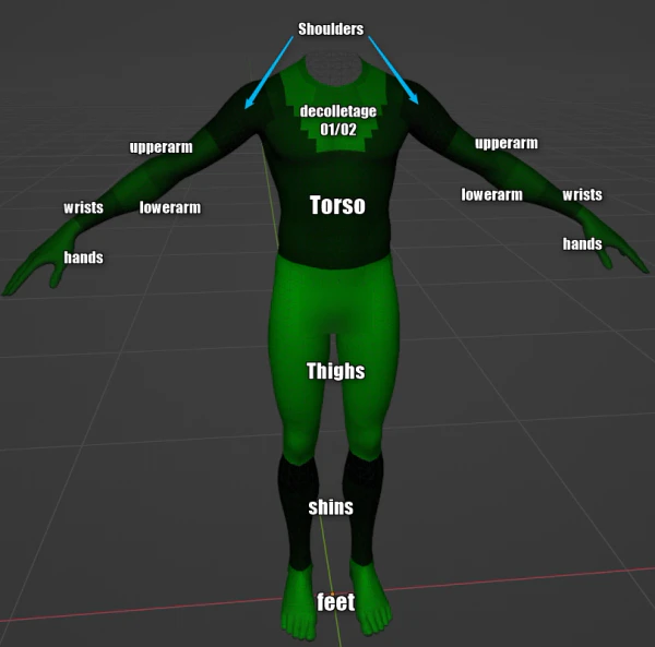 This image is for the Body Vertex Color Mask Slots and what gets hidden when using them. (The image is missing 'knees' however.)