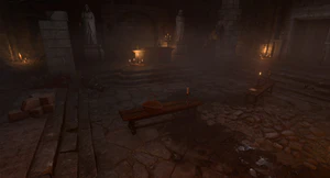 The hatch ladder initially leads into the storage, which in turn opens into a small prayer hall - presumably used for conducting the last rites for the passed out. The small altar is smeared in blood - this is the place where the temple's high priest Father Lorgan was murdered.