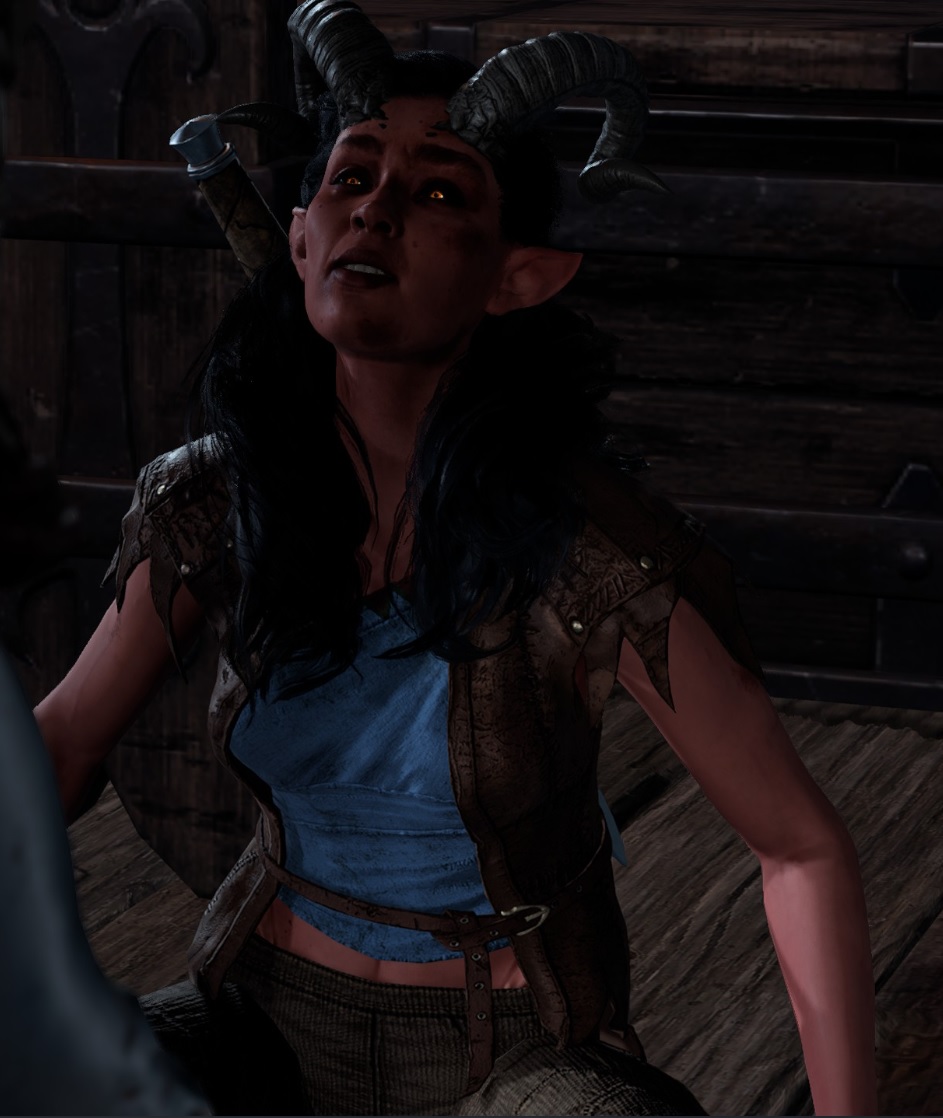 Pandirna is one of the tiefling refugees seeking shelter at the Emerald Grove in Act One. With her legs paralysed from a dodgy brew, she is given the duty to guard the refugees' storage hut.