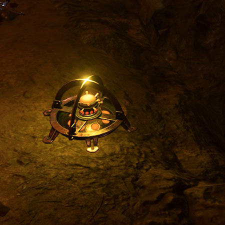 A Proximity Explosive is a mechanism, a unique type of a Blast Mine, planted on the surfaces inside the huge cave under Waukeen's Rest which is used by the Zhentarim as a base for operations in the Risen Road region. There are several such devices placed in plain sight in the hideout along wooden bridges that connect the stone cliffs. These mines might be encountered if choosing to explore the hideout while following the course of the Find the Missing Shipment quest.