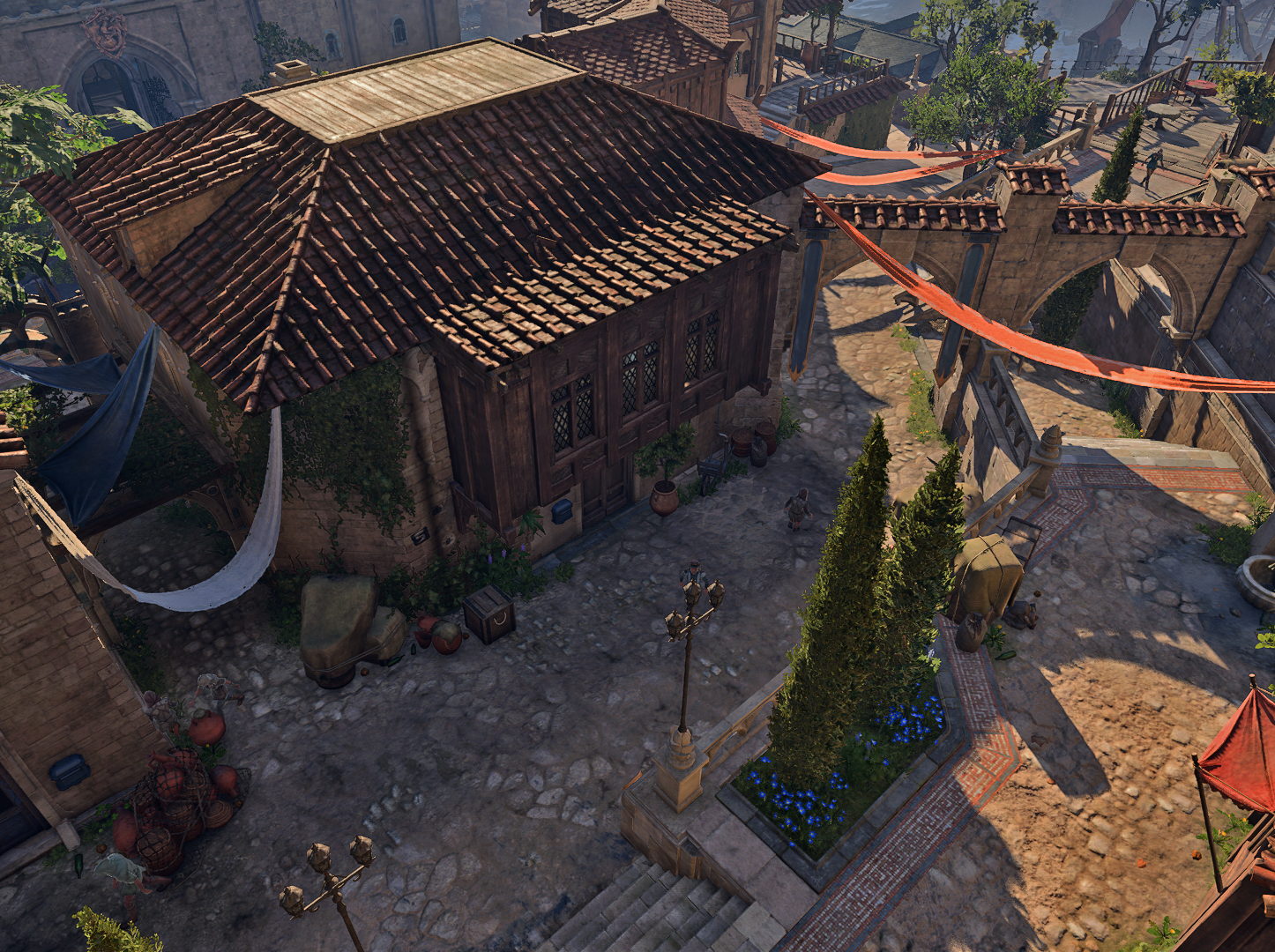 The building can be entered both from the facade and from the backside. The front doors at X: -93 Y: -109 are locked and red-outlined. The street is overlooked by a patrol of Flaming Fists and a Steel Watcher. Guards will question the party if they are spotted lockpicking the doors. Using means of Invisibility, spells like Fog Cloud, or entering turn-based mode can be helpful.