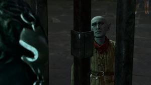 One strategy to avoid combat is to get up the rocky ledge to the west of the cells by climbing or using Fly, Jump, or Misty Step. The ledge leads to the back area of the gnomes' cell at X: 568 Y: -612 and the tieflings' cell at X: 600 Y: -617. Both back walls of the cells can be broken down with Force damage. There is also a boat at X: 575 Y: -576 fixed with brittle chains. After breaking down the walls, the deep gnomes and tieflings run to the boat. The party should also run to the boat to aid the characters breaking the chains. While this happens, the prison guards, alerted by the Scrying Eyes become hostile and try to hinder the prisoners from escaping. After defeating the guards, when all surviving prisoners are at the boat, the party must speak to Wulbren and decide if they want to accompany him to his next destination.