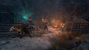 The temporary camp, acting as a relay point for the cultists of the Absolute, is at X: 87 Y: -49. When approaching it, a cutscene starts where Warrior Gronag baits a Hyena to fetch a bone, throwing it in the shadowed bushes. If he is not stopped, the hyena obeys and is consumed. Otherwise, the party can not only spare the hyena, but order the goblin to do the same (with an identical outcome). For the Dark Urge, doing this grants the inspiration Forcing Responsibility. If the hyena is spared, she may be spoken with via Speak with Animals afterwards. She tells the player character about being too cowardly to leave the goblins, but can be inspired through several ability checks. In the latter case, she runs away, only to be affected by the curse.[4]