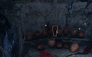 If passing through the house and to the south, along the riverbank, the party can find a round building with the entrance crossed by an armed Tripwire. Inside, under the shelf with pottery, is a locked Traveller's Chest with a Ring of Twilight inside. The key to this chest is in the conic vase on the shelf above it. Otherwise, it requires DC 10 Sleight of Hand Check to lockpick. A makeshift desk in the middle keeps remains of a hurried interrogation performed by Harpers.