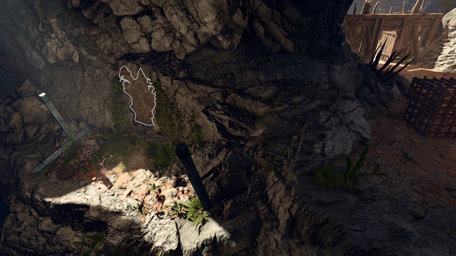 Alternatively, the party can head west of the grove's main gate following the initial goblin attack instead of immediately entering the grove, until they come across a hidden stone door. A successful perception check highlights the door itself, while a survival check reveals goblin tracks leading up to it. This route is considerably more dangerous than entering the grove normally, as it is guarded by statues that continuously shoot fire bolts at anyone within range, flammable explosives, and a small party of goblins holding the druid Findal captive. The statues are activated by runes embedded in the walls, which can be turned off by directly interacting with them or using Mage Hand. On the opposite side of the tunnel, an exit leads directly into the Makeshift Prison. This route allows the party to approach Sazza before Arka does, skipping the dialogue with her.