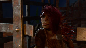 When arriving in the Emerald Grove for the first time, Sazza is caged in the Makeshift Prison at X: 189 Y: 587. If the party entered the Grove through the main gate, Arka is in the prison threatening to shoot Sazza to avenge her brother, Kanon. Meanwhile, Memnos tries to calm her, insisting that Sazza is not the goblin that killed her brother. The party has several options on how to proceed: