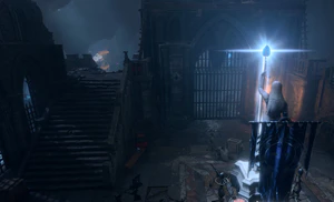 Long since abandoned, the outpost's stones walls are crumbling and its blue Selûne banners have long since tattered. Despite this, its magical defences remain functional. A statue of Selûne holds up a staff with a bright Moonstone, which channels energy into two statues on either side of the gate; they shoot blasts at any creature approaching or exiting there. These attacks are called Moonlight Artillery, and they deal 2d6Radiant damage in a radius of 4 m (13 ft) with Dexterity Saving Throw against DC 12 to halve the damage. They can only target creatures between the portcullis and the closer one of the two big rocks that lie on the last steps of the stone bridge.