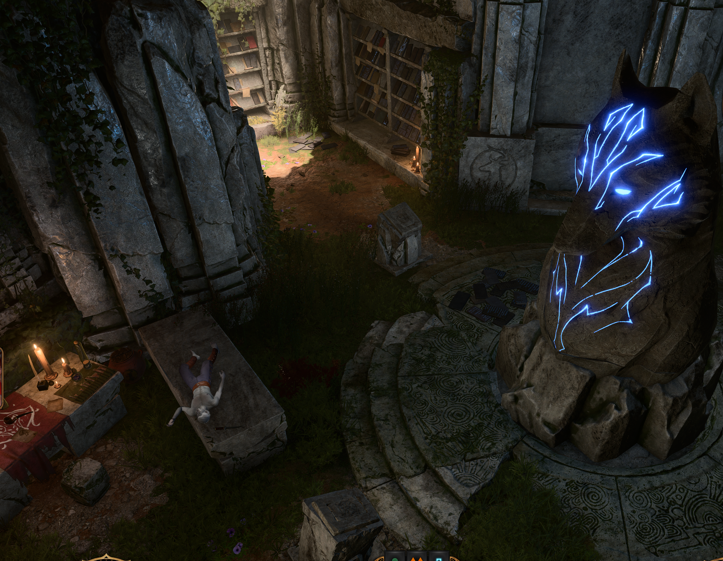 The library has another work desk at X: -444 Y: 15; several items and notes on it belong to the missing First Druid Halsin. A vial with a Mind Flayer Parasite Specimen inside it is immediately highlighted to the player character by the Dream Guardian.[5] An adjacent stone slab has been turned into a makeshift autopsy table upon which rests a Dissected Drow.
