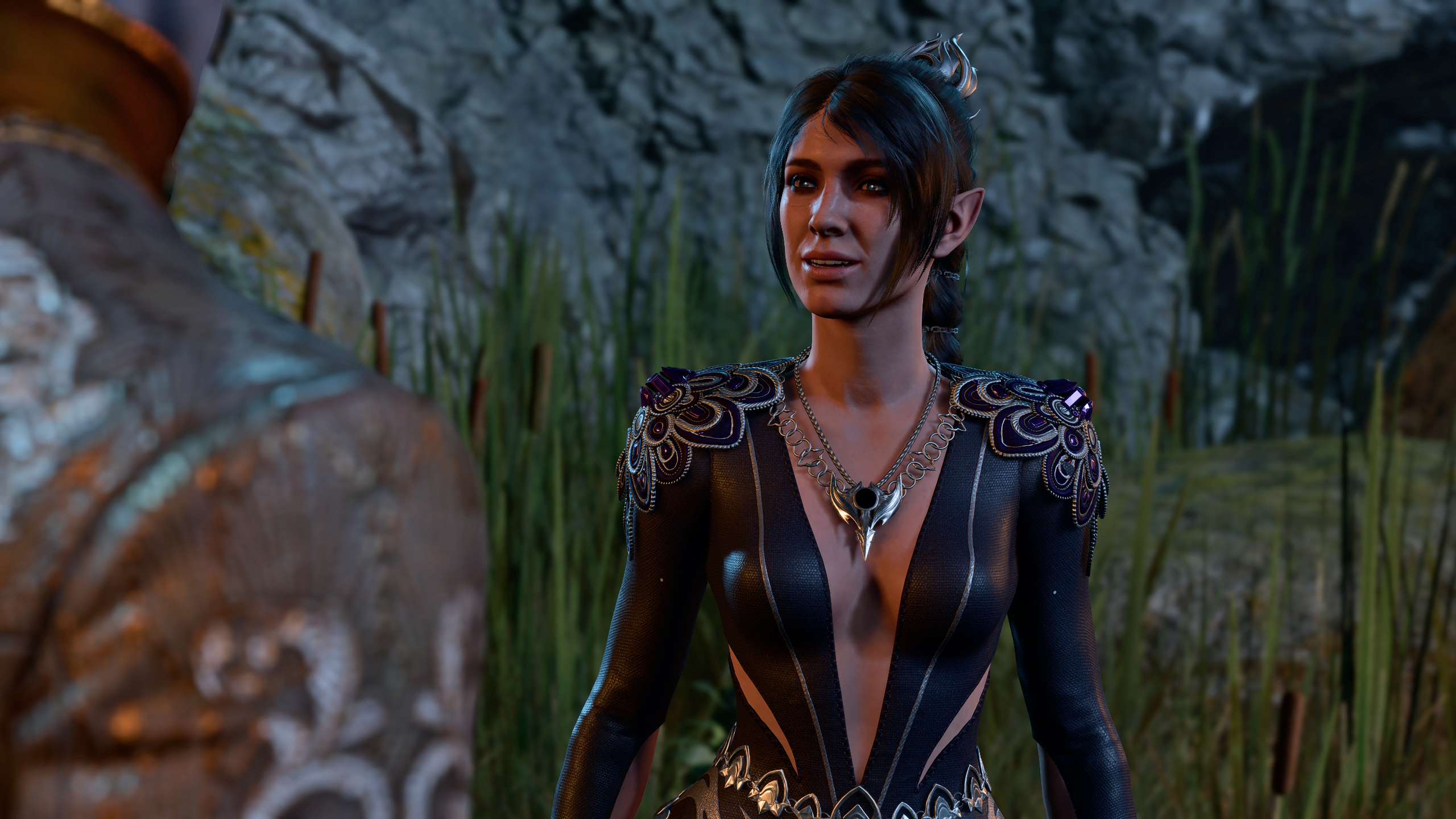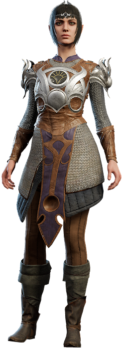 A devout follower of the Lady of Loss, Shadowheart is the sole survivor of a holy mission undertaken on the Mistress of the Night's behest. She alone is left to deliver a relic of immense power to her coven in Baldur's Gate while threatened by a strange new magic that is burgeoning from within. Her faith plays an important part in her story throughout the game, and she can be steered towards or away from it.
