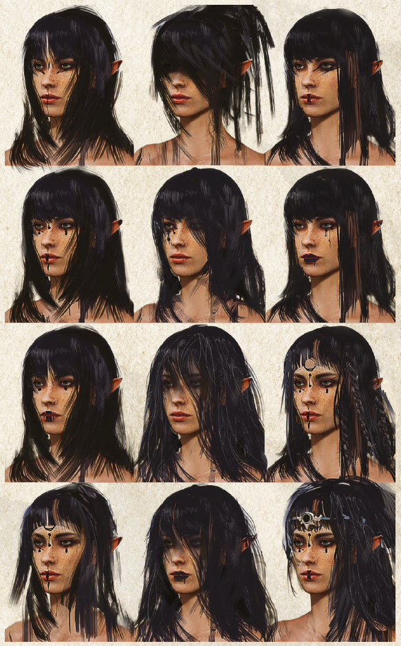 Lithe of frame, well dressed and with meticulously managed features, Shadowheart is not unattractive[5][6] and may, if mentioning this to her (e.g., if romanced), acknowledge this matter-of-factly.[7] She has straight, coal-black hair and a long, flowing ponytail fastened in segments by elaborately crafted silver loops. Her fringe hair is kept short and straight, revealing her brows beneath and a scar running from her nose to her right cheek. Hair adorns her face on the sides, reaching past her chin, her pointed ears barely peeking through them, and her eyes, light-green with speckles of yellow, are contoured by dark make-up. Though rarely seen, she has a black circular mark on her right hand, a wound given by Shar, causing Shadowheart pain whenever she engages in behavior the Lady of Sorrows disapproves of. Though appearing youthful due to her elven heritage, she is over 40 years old.[8]