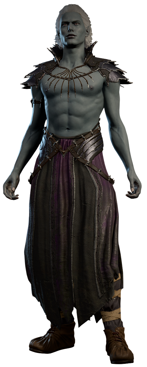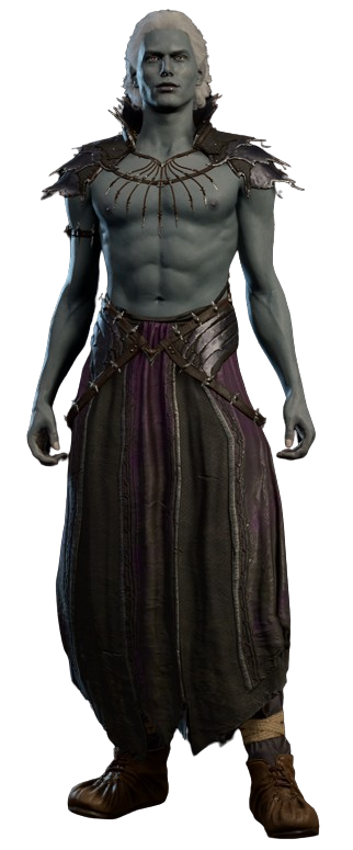 Hailing from the Underdark, Sorn was originally employed as a courtesan, and Nym as an artisanal masseuse. The pair fled the Underdark due to the matriarchy's mistreatment of men, ultimately coming to work in Baldur's Gate. Sorn seems to thoroughly enjoy his line of work, particularly fulfilling extreme and interesting fantasies; he remarks that Drow culture is obsessed with bondage, which became boring.