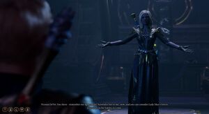 • Attempting to enter the Threshold of Loss door instantly causes the Sharran guard standing near the door, Fidelian LamonaFidelian Lamona to become permanently hostile, which also makes Viconia and the rest of the cultists temporarily hostile. It is possible to enter and use the Chamber of Loss, dispatch the hostile guard, evade the rest of the Sharrans, and then come back for dialogue.