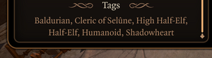 Additionally, characters multiclassed into both cleric and paladin receive another tag corresponding to their deity. The ability for paladins to choose a deity was removed after Early Access, but paladins with cleric levels may still receive these tags.