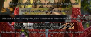 - Added the Elder Brain references back in. While it is definitely playful wording, it is impossible to ignore the obvious reference in the journal. Should probably be rephrased at some point, though. I think the Orin dialogue can be removed, mainly because while the incestuous undertones are definitely there, the fact is that Orin also acts like that with everybody. In the future, it's best to start the discussion on talk page before removing information. If no one engages for a while, it is probably ok to remove it. Willowisp (talk) 19:18, 5 October 2023 (CEST)