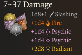 Free-form field for adding additional information about a damage instance. For example, "per ray" for Scorching Ray damage, "if the target is a Fiend or Undead" for extra Divine Smite damage, or "delayed" for Melf's Acid Arrow damage.