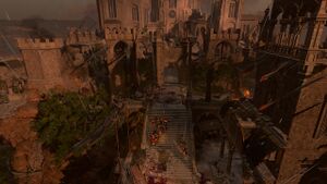 The High Hall Courtyard is a large area before the High Hall proper. Entering this area commences a fight with Absolutist cultists, Winged Horrors, Goblins, an Ogre, a Spectator, and several Mind Flayers. It is possible to bypass this battle by approaching the High Hall from the northern or southern routes, or taking the sewers.
