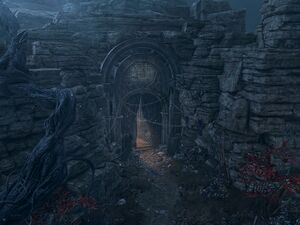 Regardless of the path they use, the party eventually come out to a small clearing in front of high cast-iron gate built straight into a rock side. The gate is entangled with silvery chains crossing it several times, adorned with Selûnite sigils. However, it is clear that thick metal is cambered from powerful blows when somebody or something made its way out.