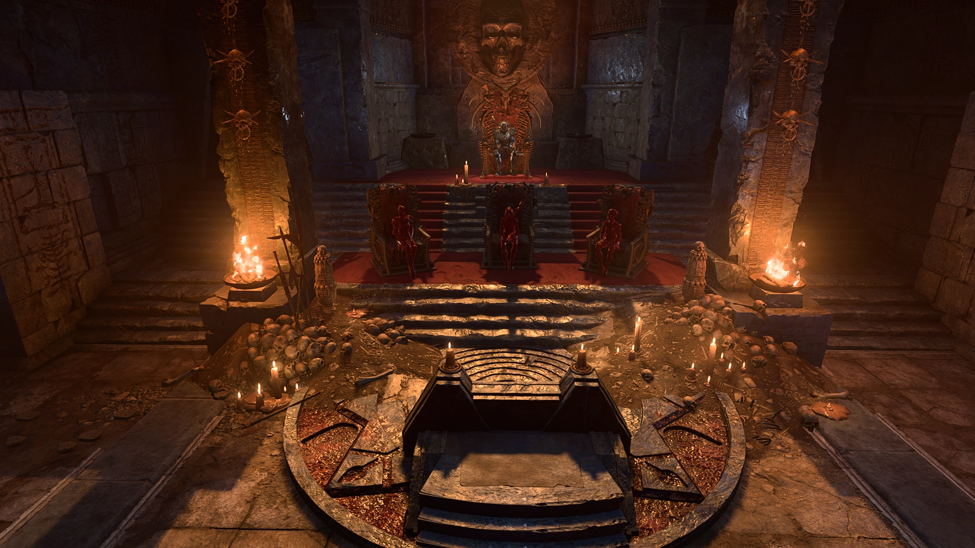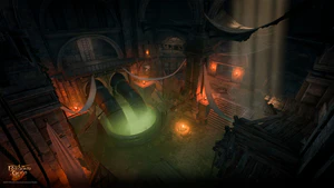 The temple is a large, spatious area requiring the Amulet of Bhaal to open the stone door, which can be acquired at the end of the quest Impress the Murder Tribunal. It is the sanctum of Orin the Red, and contains many worshippers of Bhaal as well as altars for victims to be sacrificed over and subsequently displayed on the walls.