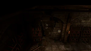 Beyond the area with the chains, there is a secondary room with a hatch, which leads to the sewers.