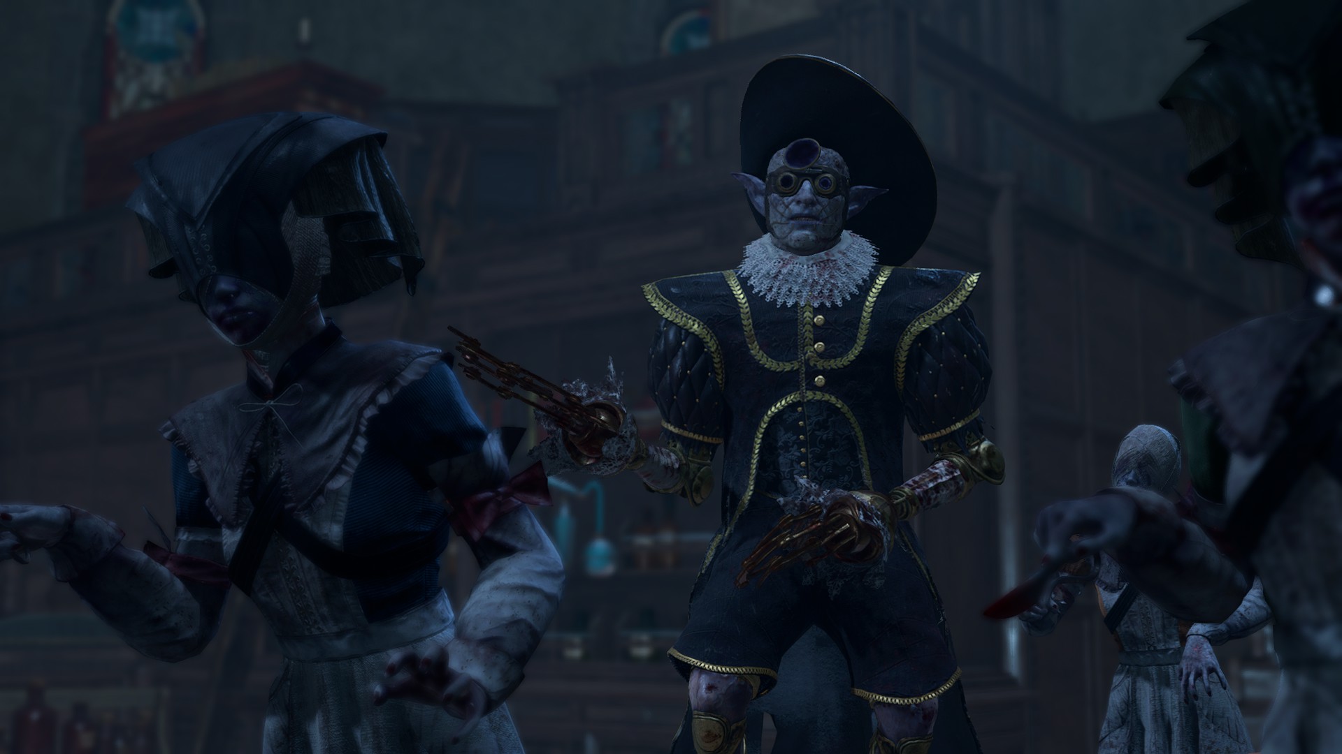 If the party attack Malus outright, he is joined by Sister Hunna, Sister Vanessa, Sister Anya, and Sister Geanne. Otherwise, Malus explains they have nearly cured the "patient." He states that absence is the heart of Shar's teachings, and asks "What is the light of eyes but the cancer that causes one to witness the laceration of being?" With this pronouncement, he tears out the patient's eyes, completing the "cure." He then asks the party if they are ready to be cured as well.