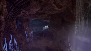 The Water Queen's Cellar is a cave found underneath the Water Queen's House. It can be accessed by exiting the house from the backside, traversing its small beach and going through a passageway. Its main purpose is storage of treasure which has been donated via the Offering Chest in the portico area.