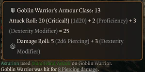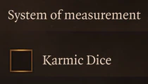 When the Karmic Dice option[7] is enabled (it is by default), the game mitigates bad-luck streaks (e.g., many missed attacks in a row). It applies to all combatants, including NPCs and enemies, as well as ability checks made while in dialogue. It does not apply to ability checks made outside of dialogue, such as Sleight of Hand checks when picking locks or Perception checks to discover hidden objects. It does not penalise lucky streaks.[8][9] Larian described using Karmic Dice as akin to having a "friendly DM".[url 3] Some players report that this can make fights feel quicker or more potent, but results can vary.