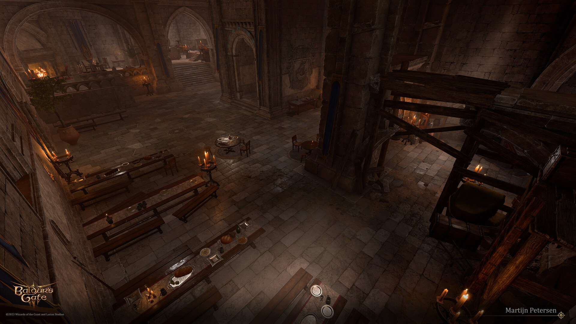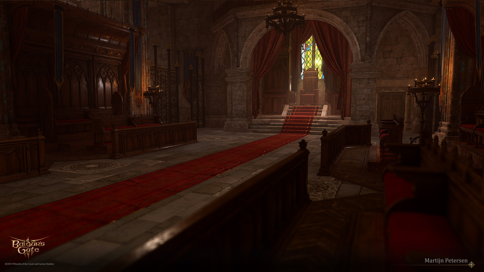 The second floor consists of the audience hall and several adjacent balconies. No matter the time of their arrival, upon entering the Audience Hall for the first time, the party can witness the ordaining Enver Gortash as an Archduke of Baldur's Gate. Upon noticing the party, Gortash interrupts the procedure to have a chat with them. The dialogue itself differs depending on whether the player character is the Dark Urge, Karlach or Wyll Origins, or in case either of the latter are active party members.