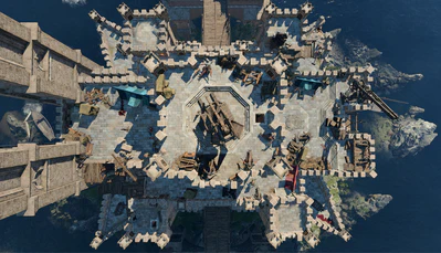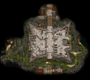 The Wyrm's Rock Fortress is standing on a rocky isle in the middle of the river Chionthar, taking up the whole space save for minor cliffs around. Wyrm's Rock Fortress is connected to the south to Wyrm's Crossing, and to the north to the Lower City by two drawbridges. As the legend goes, the isle once was home to a bronze dragon, who swore to defend the city from greatest dangers.