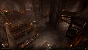 There are a number of ways to enter the building: the party can use the main double doors in the southern wall, lockpick a side door in the western wall, climb up at the bell tower and use the doors there, or descend via a ladder from the bell tower roof.